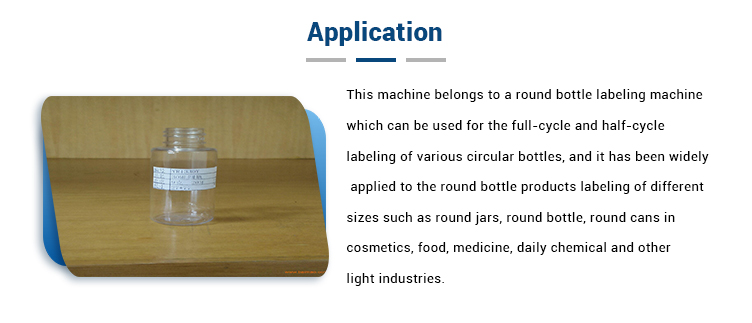 이 기계는 다양한 원형 병의 전체 사이클 및 반 사이클 레이블에 사용할 수있는 둥근 병 라벨 기계에 속하며 둥근 병, 둥근 병과 같은 다양한 크기의 둥근 병 제품에 널리 적용됩니다 , 화장품, 식품, 의약품, 일일 화학 및 기타 경공업의 둥근 캔. 장비 구성 : 전기 캐비닛, 운반 메커니즘, 별도의 병 장치, 롤링 라벨 장치, 브러시 라벨 장치, 1 # 라벨링 엔진, 운영 시스템 및 제어 시스템.